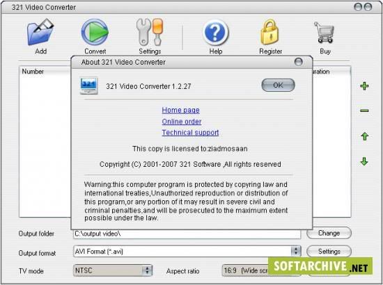 321 Video Converter is a powerful video tool to convert all popular video formats to AVI, MPEG, VCD, DVD, WMV formats.It can convert almost all video formats, e.g. AVI/DIVX/XVID/DIV, MPEG/MPG/DAT, WMV/ASF/ASX, RM/RMVB, MOV/QT, 3GP/3G2, MP4/M4V, and FLV. The main features include: adjust output video quality, adjust 4:3 or 16:9 video aspect, all encoders/codec are built-in and any supported conversion can be done once you downloading the software .Fast conversion speeds and high quality , simple GUI and very EASY to use.