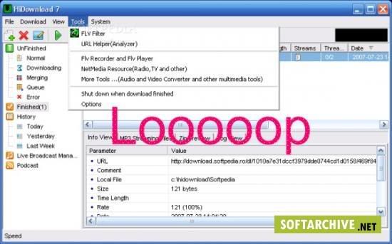 HiDownload is a multi-threaded download manager that allows you to download individual files (or lists of files) from web and FTP sites while maximizing the potential of your internet connection. It also supports multimedia streaming and and RTSP (Real Time Streaming Protocol) with optional resume, enabling you to download movies, music and capture streaming video and audio,record radio from Internet. It also offers a tool to analyze MMS/RTSP URLs, as well as a built-in Broadcast Manager.
