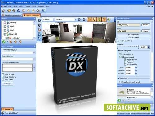 DX Studio is a complete integrated development environment for creating interactive 3D graphics. The system comprises of both a real-time 3D engine and a suite of editing tools, and is the first product to offer a complete range of tools in a single IDE. The system includes both 2D & 3D layout editors, and allows full JavaScript control of everything from changing the background to editing meshes in real-time. Don't leech from kopona.net. Using DX Studio you can build complete real-time interactive applications, simulations or games, for standalone use or for embedding in other Microsoft Office/Visual Studio applications. The engine behind DX Studio uses DirectX 9.0c to make the most of 3D graphics hardware acceleration, and includes support for the latest pixel and vertex shader effects found on the more powerful 3D graphics cards.